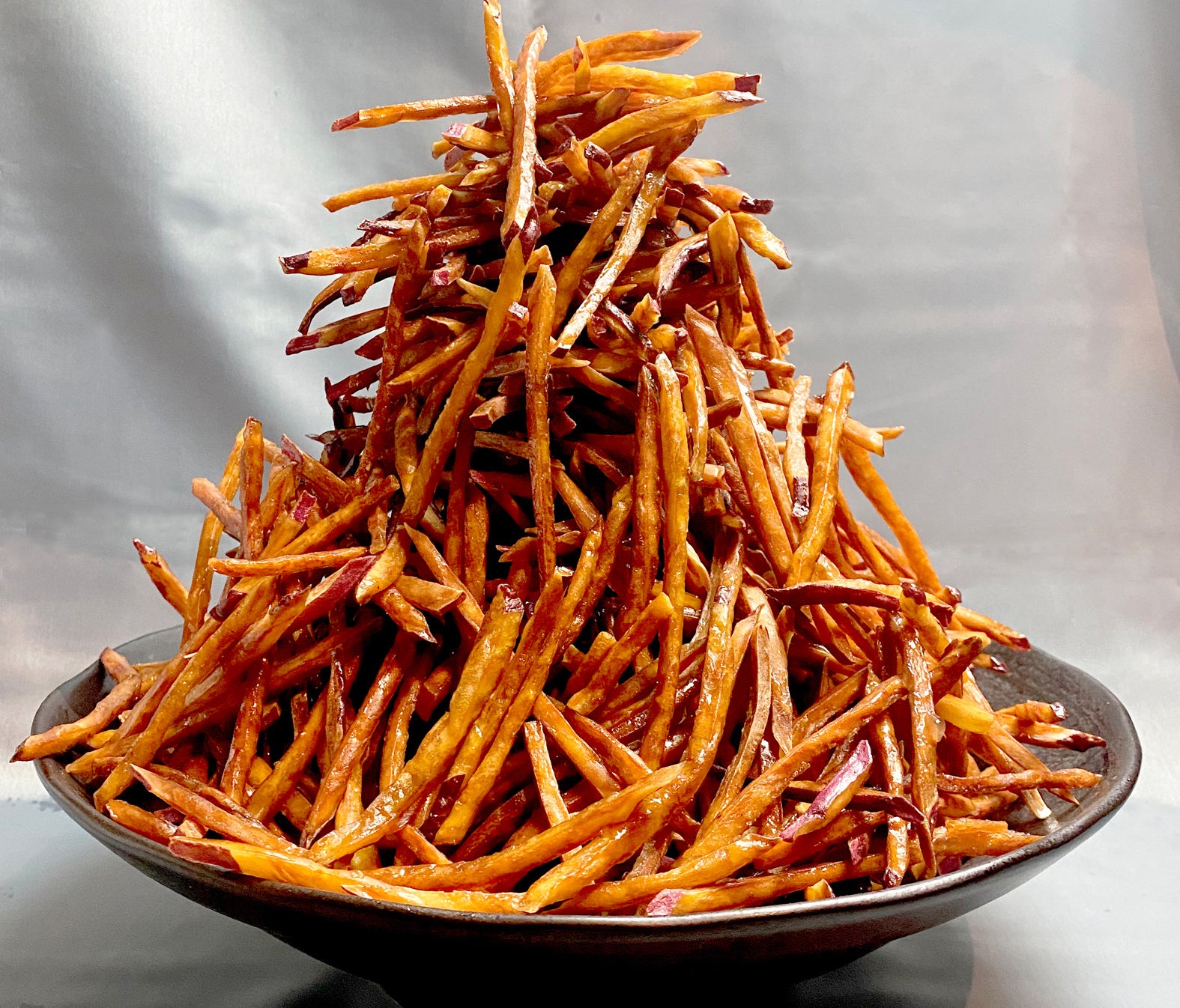 黄蜜堂の看板メニュー『芋けんぴ』は、良質な菜種油でカリカリに揚げ、お芋本来の甘味もしっかりと感じられるよう優しい甘さのきび糖の蜜でコーティングしたクセになる一品!もう一つの名物『できたて半生芋けんぴ』は、極細にカットした旬のお芋を二度揚げし、きび糖の蜜に潜らせました。カリカリの食感と蜜のしっとり感が味わえる大学芋と芋けんぴが融合したかのような一品です。